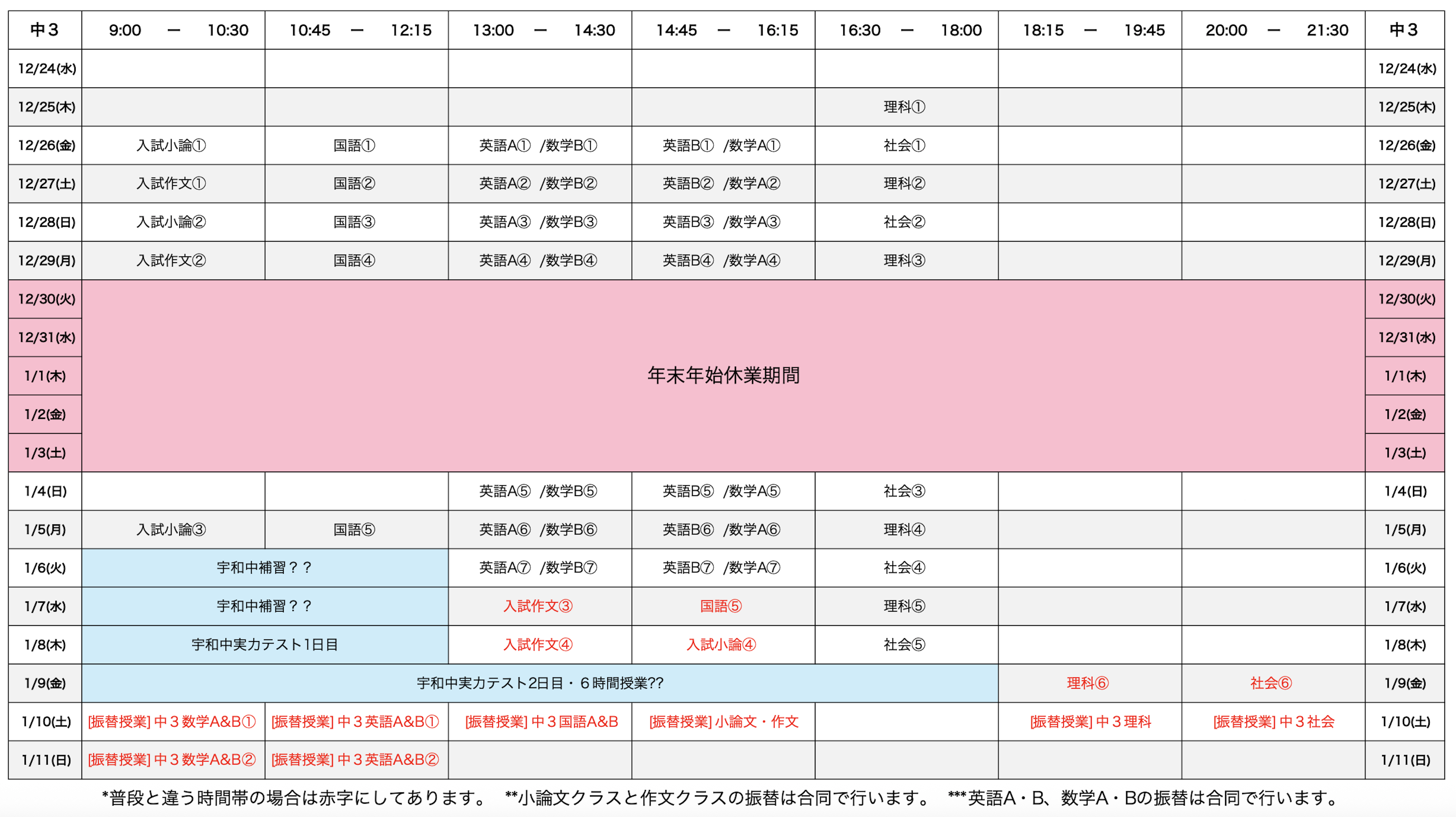 中3生は開講教科が多いため、各クラスの案内欄とは別に表記します。