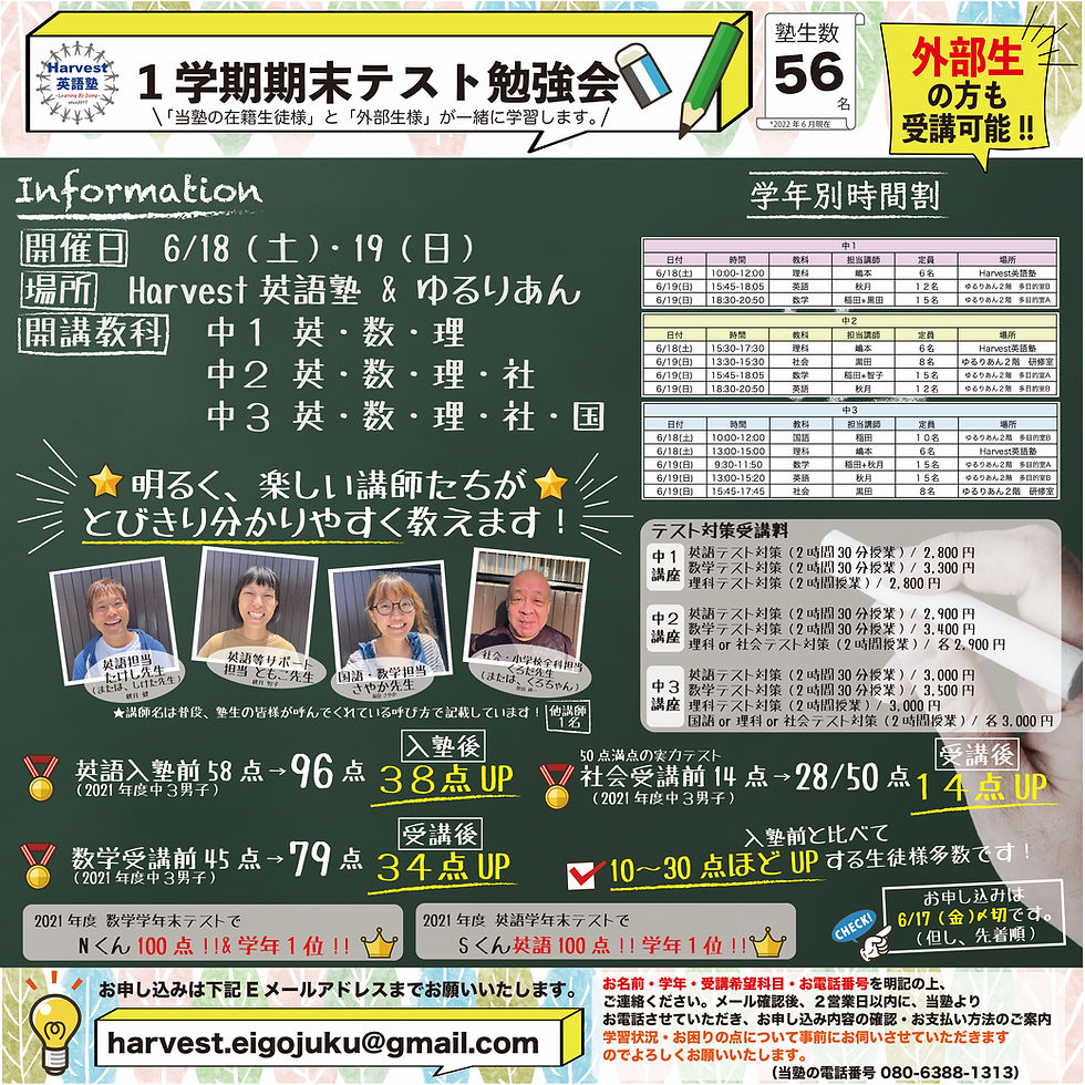 ![中学生 1学期期末テスト対策[5教科] 『外部生』様募集を開始! 6/11(火)〜6/18(木)](https://static.wixstatic.com/media/59b6a7_3d9c120395c14209978a029d7ed09055~mv2.jpg/v1/fill/w_980,h_980,al_c,q_85,usm_0.66_1.00_0.01,enc_avif,quality_auto/59b6a7_3d9c120395c14209978a029d7ed09055~mv2.jpg)